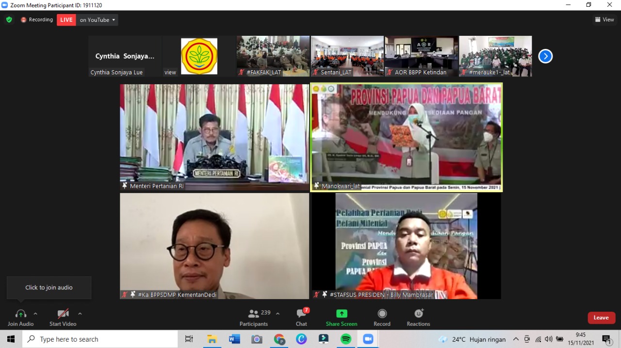 Manokwari, Oerban.com – Kementerian Pertanian (Kementan) melalui Badan Penyuluhan dan Pengembangan Sumberdaya Manusia Pertanian (BPPSDMP) terus melakukan penguatan kapasitas SDM pertanian di seluruh penjuru, tak terkecuali wilayah Papua dan Papua Barat. Senin, (15/11/2021) Menteri Pertanian (Mentan) Syahrul Yasin Limpo (SYL) resmi membuka Pelatihan bagi petani milenial di Papua dan Papua Barat.