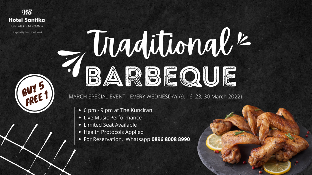 “Setiap hari Rabu selama bulan Maret 2022, mulai pukul 18.00 WIB – 21.00 WIB, tamu dapat dengan sepuasnya menyantap hidangan all you can eat Traditional Barbeque sambil menikmati Live Music di The Kunciran, area outdoor terbaru milik Hotel Santika BSD Teraskota,” ujar Public Relations Hotel Santika BSD Teraskota, Fanny Ratnasari.